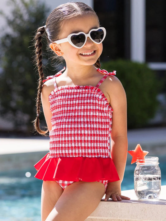 Vintage Red Gingham Peplum Smocked Bodice One Piece