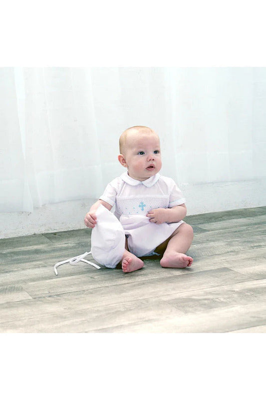 Boy Baptism and Christening White Smocked Cross Romper with Bonnet