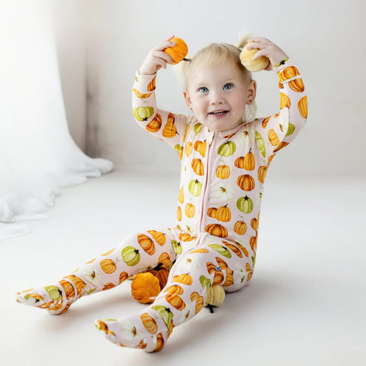 Ruffle Footie with 2 Way Zipper in Baby Rose Pumpkin Patch