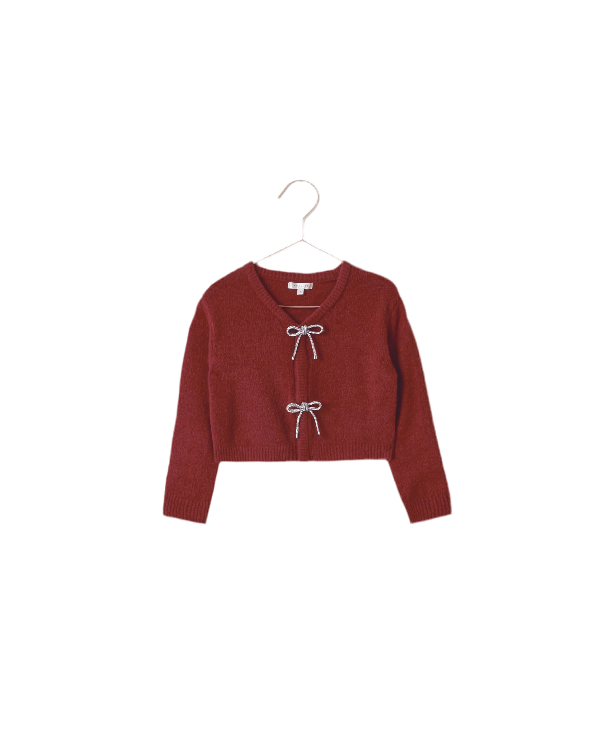 The Bow Cardigan is a sweet layering piece featuring a classic knit body with delicate bow details down the front. Designed for both comfort and charm, it pairs beautifully with holiday dresses or can be worn as a cozy statement piece on its own.