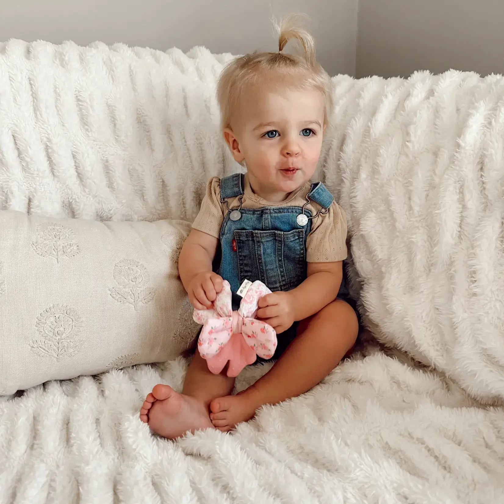 This adorable essential combines a soothing silicone teether with soft plush and crinkle sounds. It is sure to delight your little one’s senses!