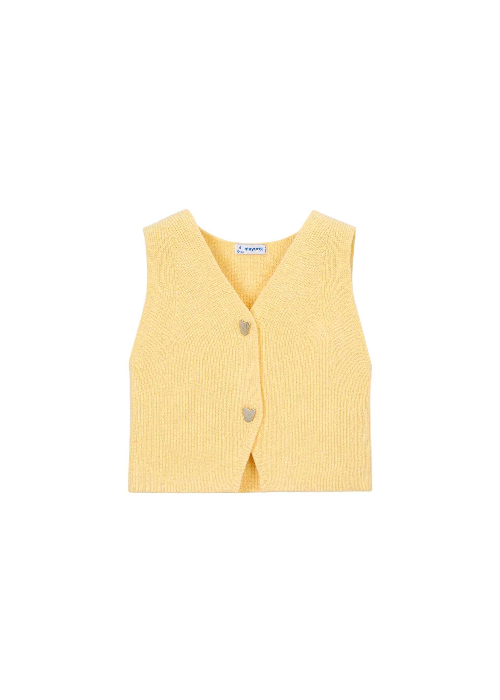 Butter yellow knit vest top, perfect for spring and summer. Features elegant gold hardware for a stylish finishing touch.