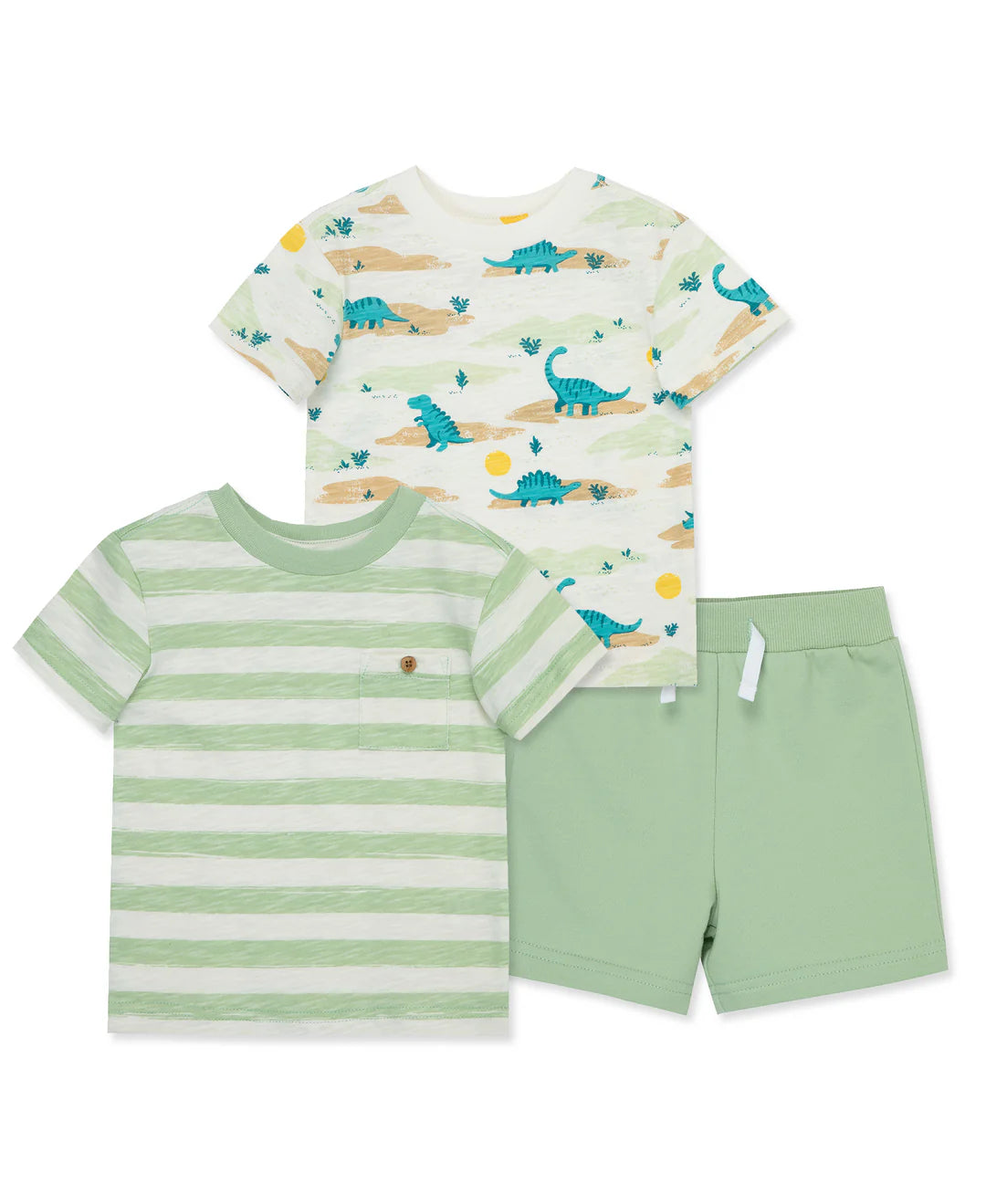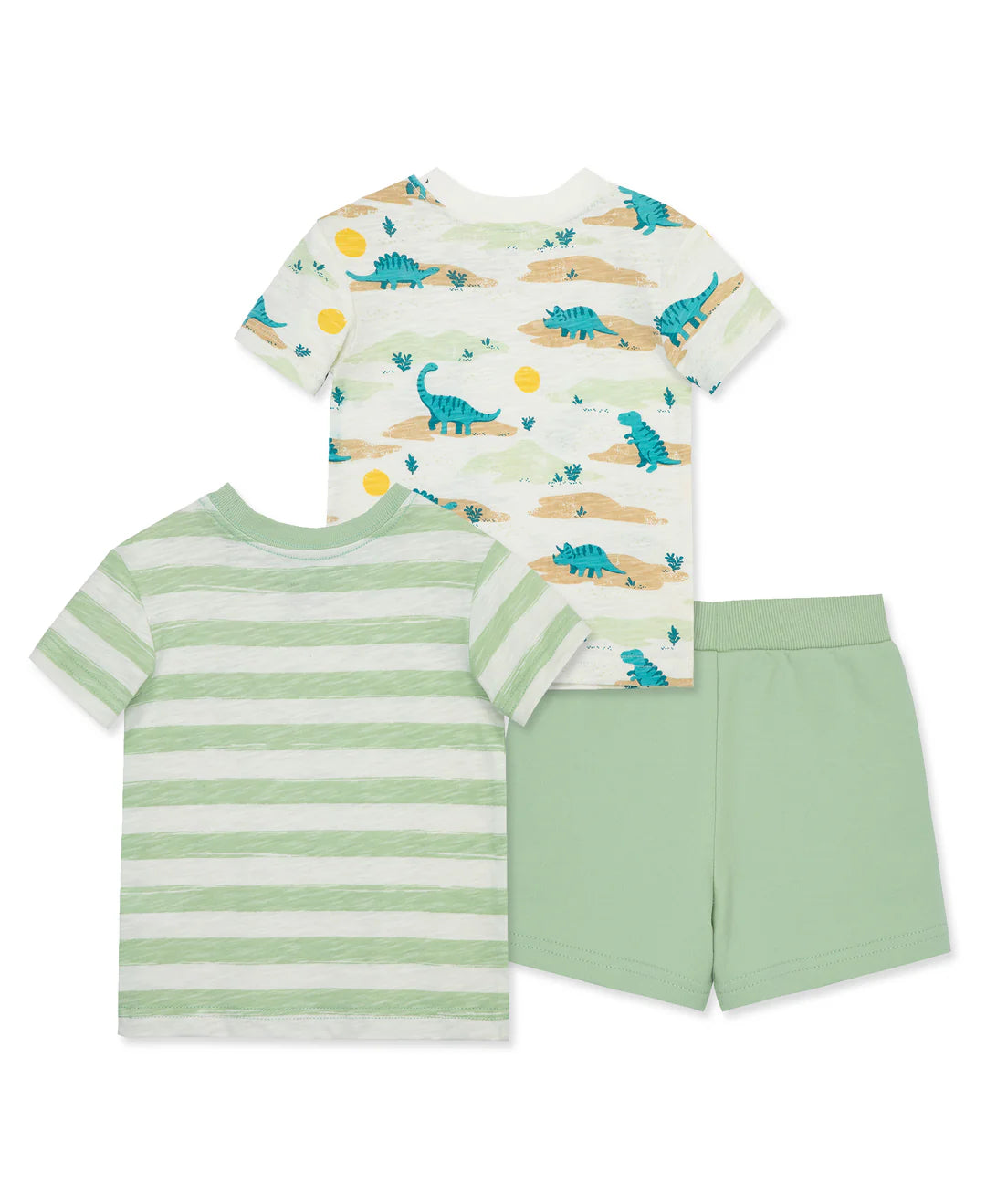 - ROAR into a season of fun with a Toddler boys' play set featuring two dino print shirts plus a pair of shorts. Fabric: Shirts: 100% Cotton; Short: 58% Cotton, 42% Polyester