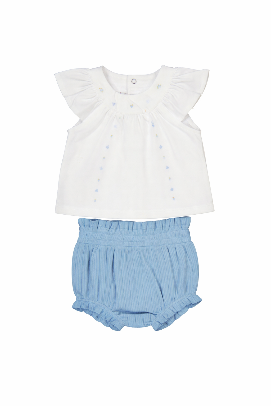 Cute two piece top and bloomer set in cream and lagoon blue.