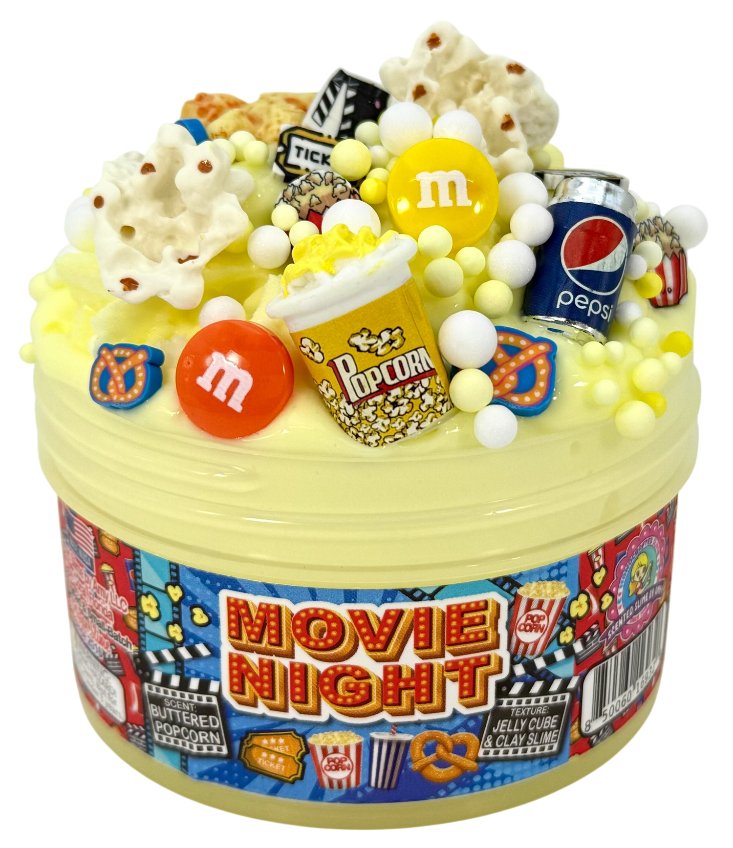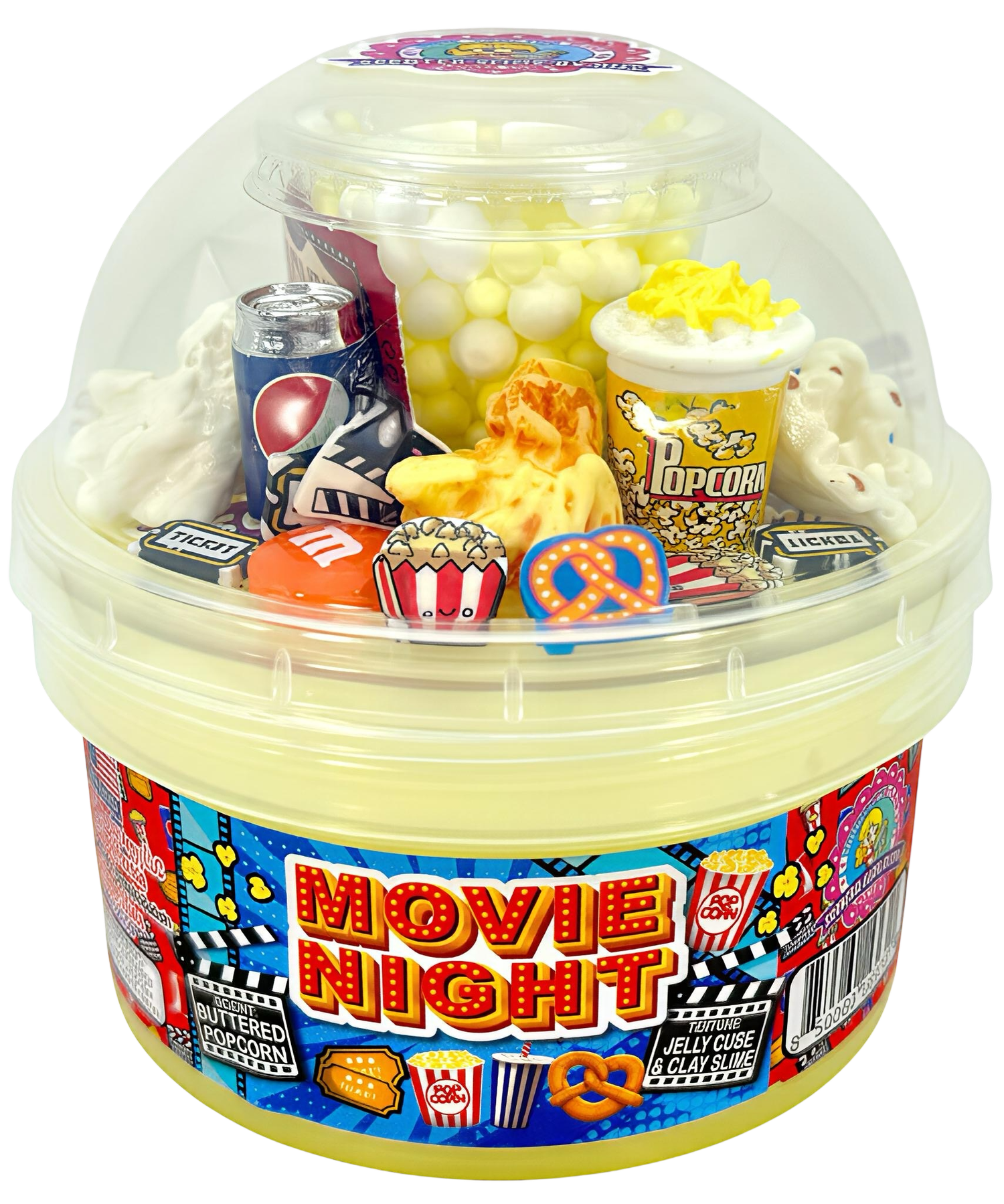 Grab your snacks and get cozy with Movie Night! 🎬🍿 This fun jelly cube clay slime is scented just like hot, buttery popcorn fresh from the theater. Each dome is packed with adorable movie-themed charms like tiny popcorn pieces, a soda can, a popcorn bucket, mini candies, and even a cute little movie ticket, making it the perfect slime for any film lover’s collection! ✨