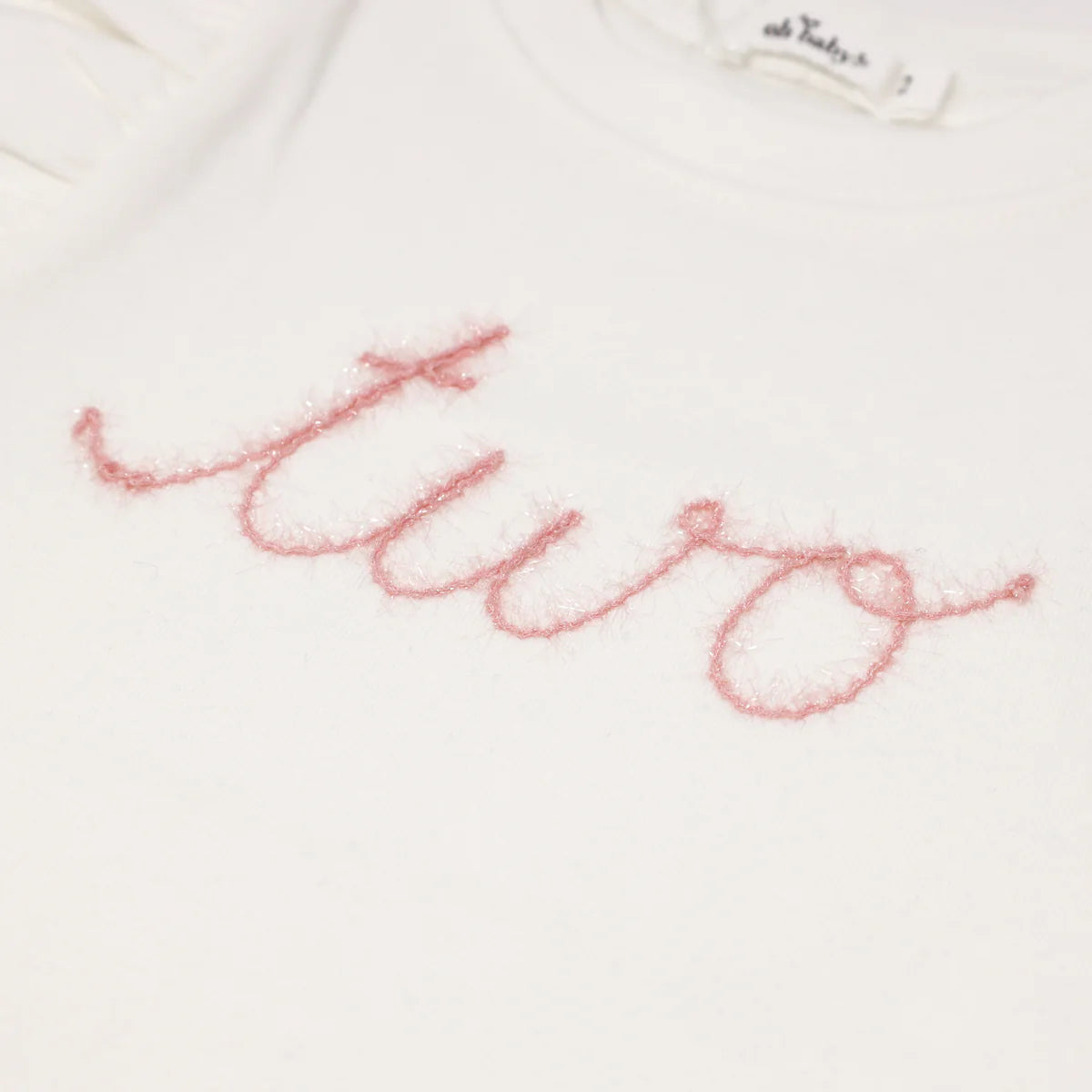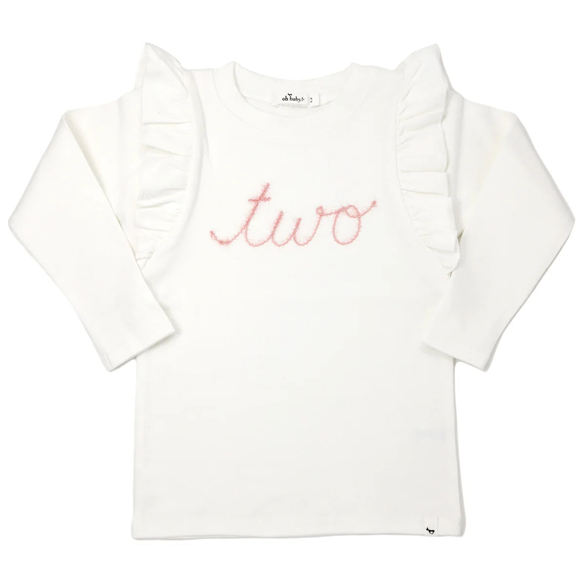 Long sleeve tee with ruffle accents. Featuring an embroidered "two" applique for 2nd birthday fun. Designed in Minnesota.