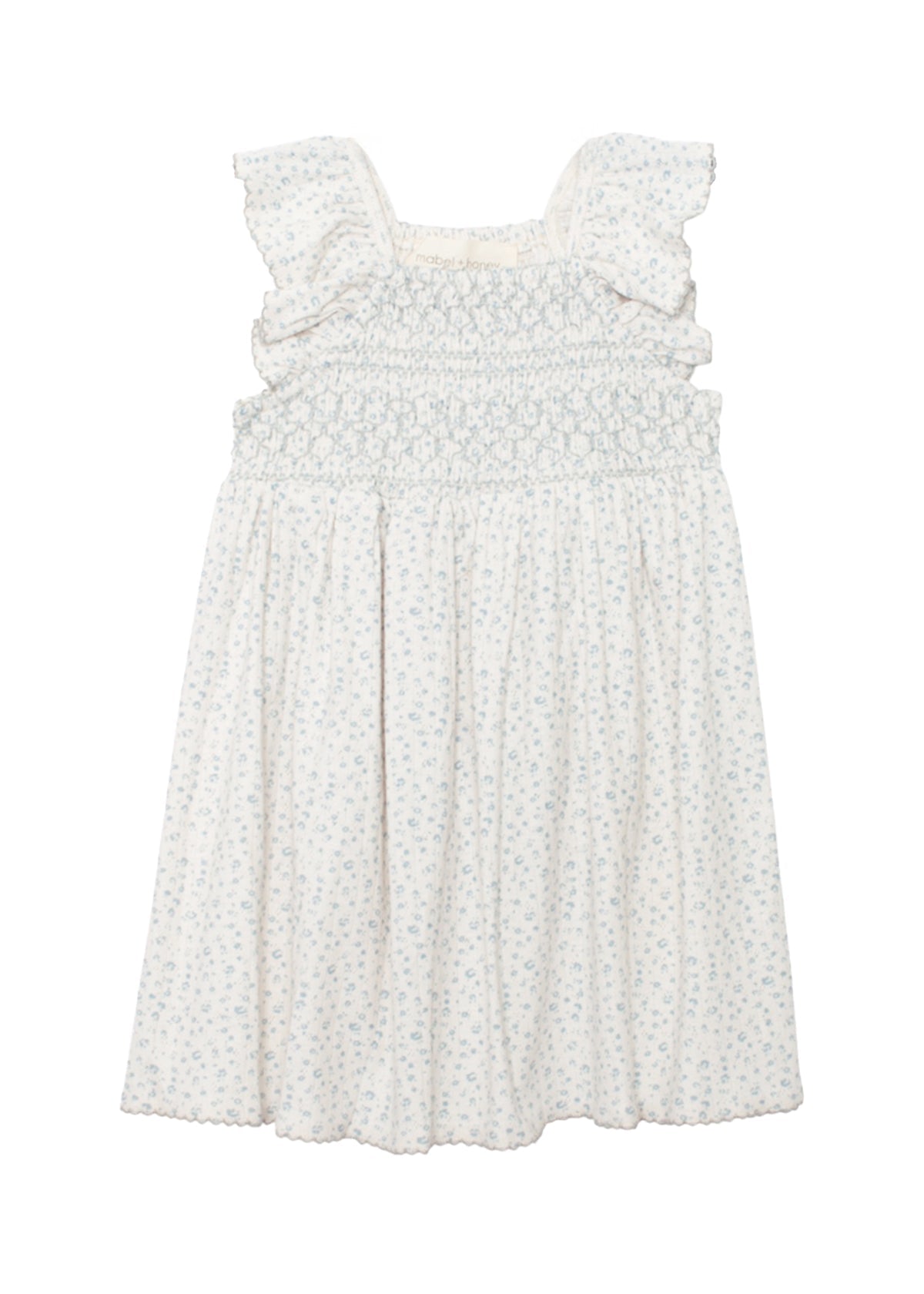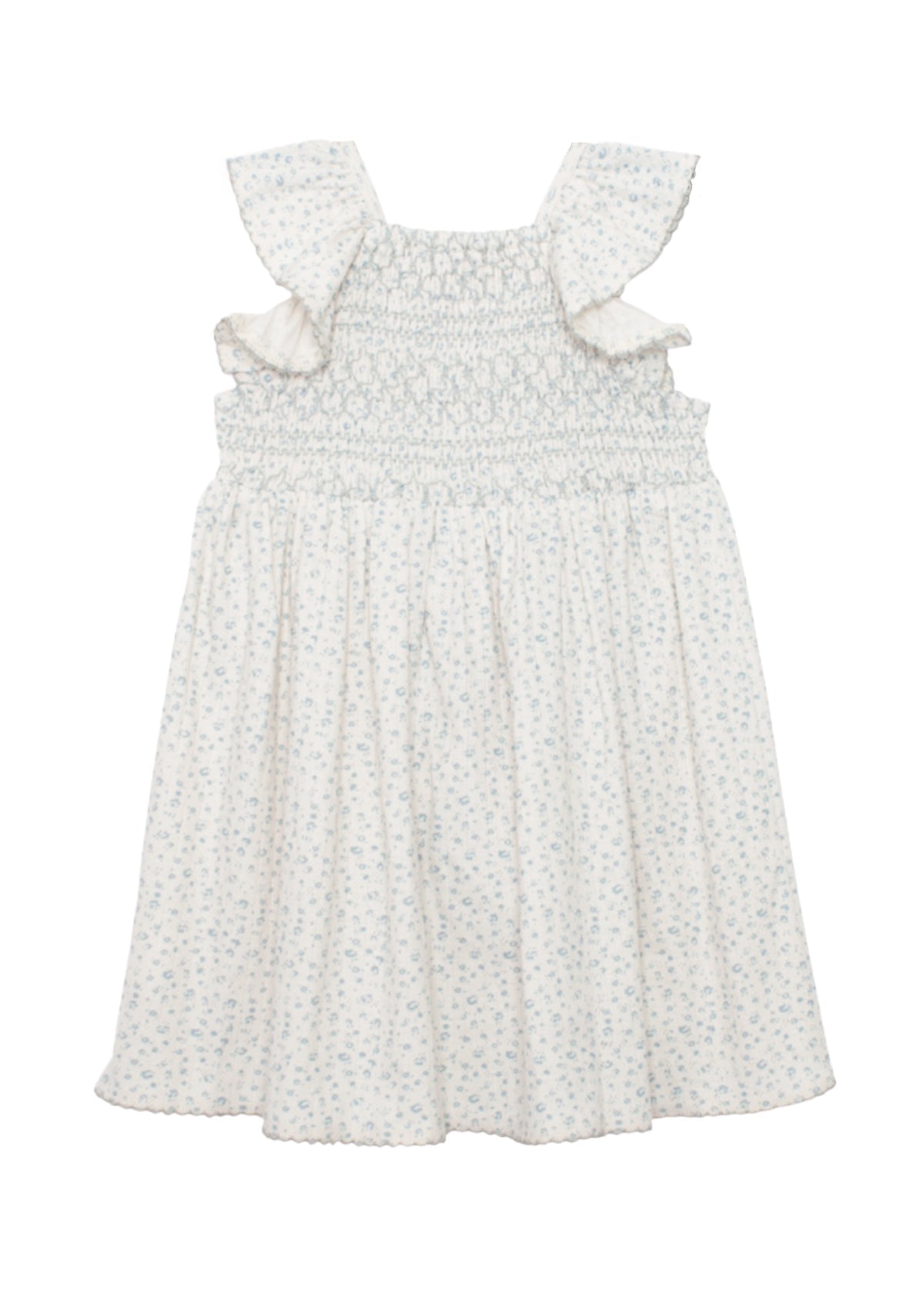 Create picture-perfect moments with this beautiful dress, made from soft floral print knit fabric, it features a smocked bodice, flutter sleeves with scallop embroidery detail.