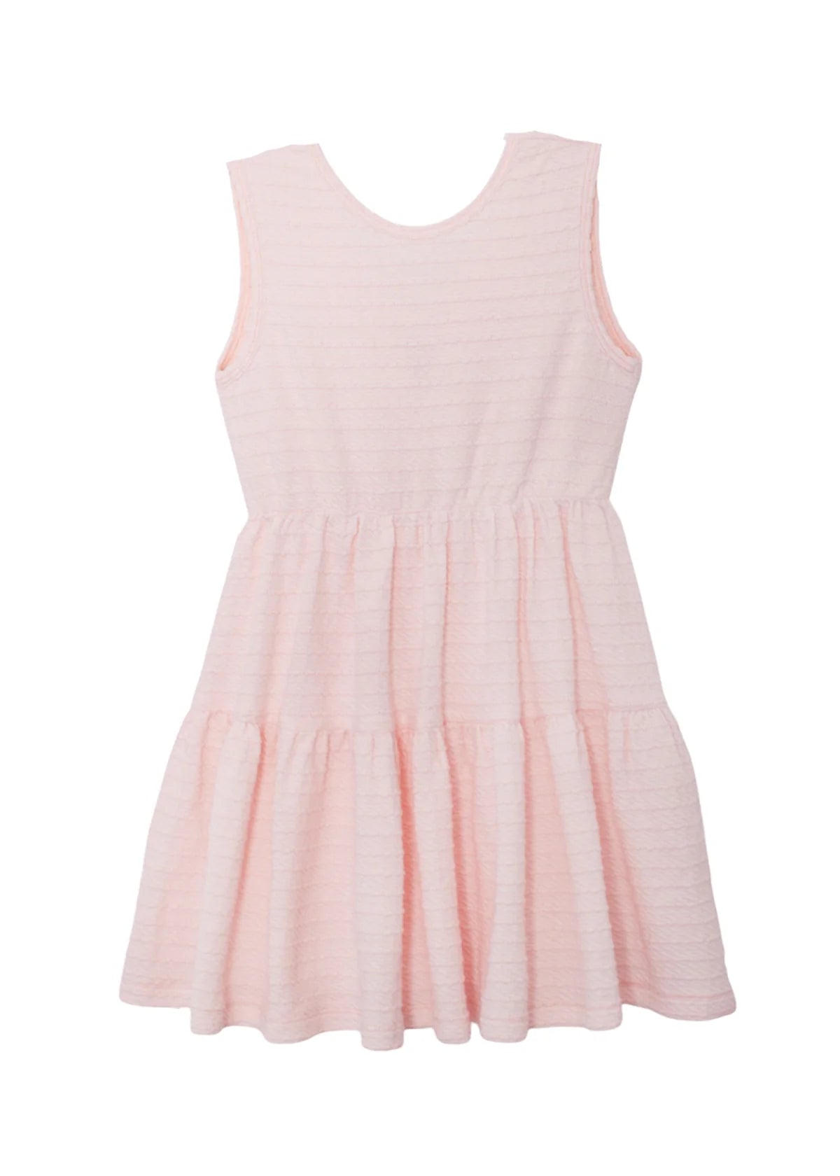 This sleeveless light pink dress features a round neckline and a tiered, gathered skirt for added volume and movement. The subtle horizontal stripe pattern adds texture, while the flared design ensures a comfortable fit. Even more stylish with the back bow detail for a touch of sweetness.