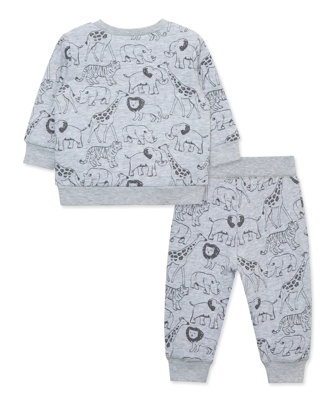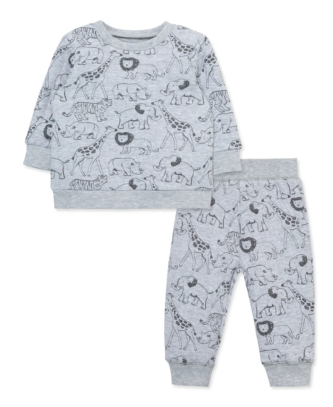 Safari animals roam across this toddler boys' sweatshirt set that will keep him cozy.