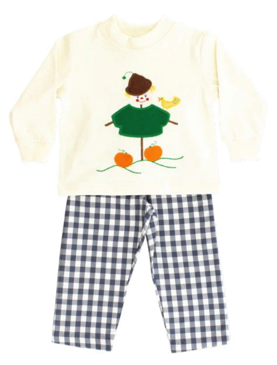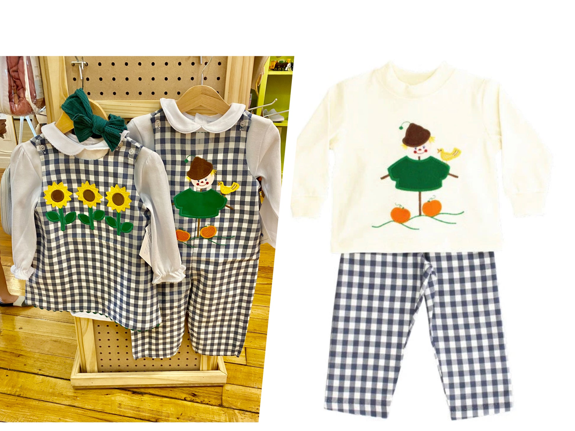 Harvest season is here! Your farm boy in the making will fit right in with this adorable scarecrow set. Featuring a comfy long-sleeved tee and contrasting gingham pants, this one is perfect for the pumpkin patch! Pairs nicely with the girls sunflower jumper and the boys scarecrow john john for coordinating brother/sister outfits.