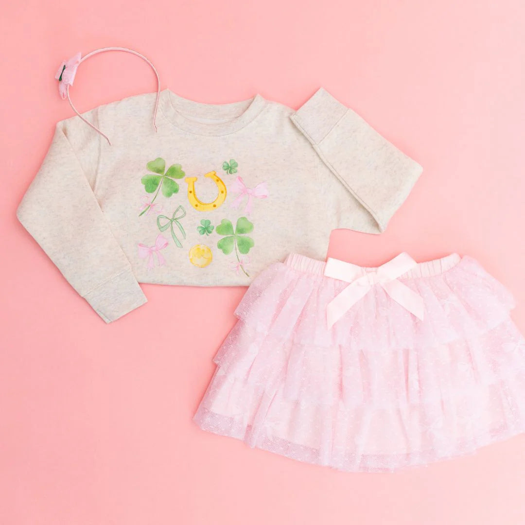 This super cozy sweatshirt is a magical mix of all things lucky and sweet, sprinkled with vibrant green shamrocks, cheerful pink bows, and a lucky golden horseshoe!