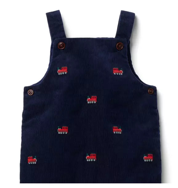 - Next stop: first holiday moments. Our soft velvet overall features embroidered trains and a little back pocket too. Consider it your ticket to style.