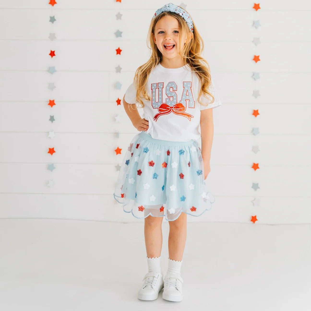 This festive white tee adds a touch of patriotic charm and sparkly flair, making it a star-spangled staple for any little patriot's wardrobe.